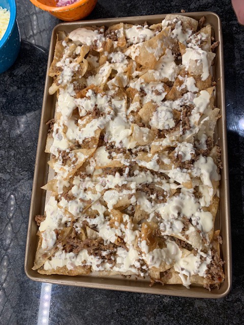 - Place chips on a cookie sheet and top with sausage, rest of red onion, cream sauce and then mozzarella.